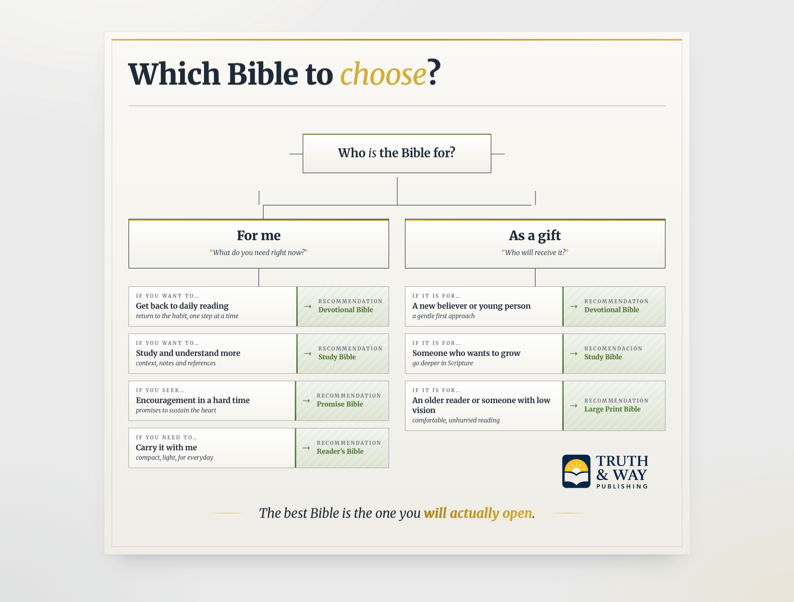 It's not the same to be returning to faith after years away, wanting to deepen your biblical study, seeking encouragement in a difficult season, or wanting to give a Bible as a gift. Each need calls for a different Bible.